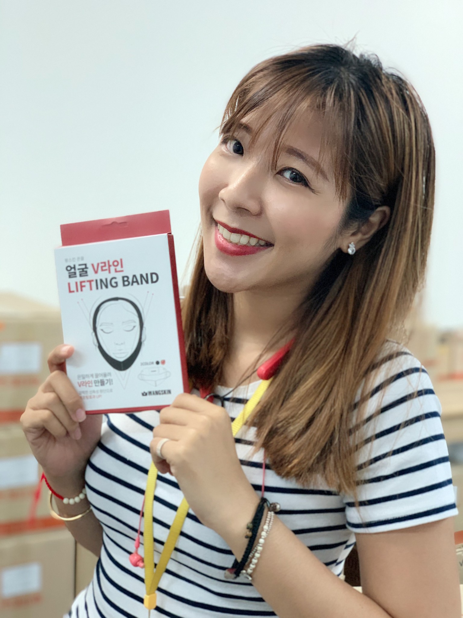 1. Sau khi rửa sạch mặt, quấn thật nhẹ nhàng dây đai theo đường quai hàm.